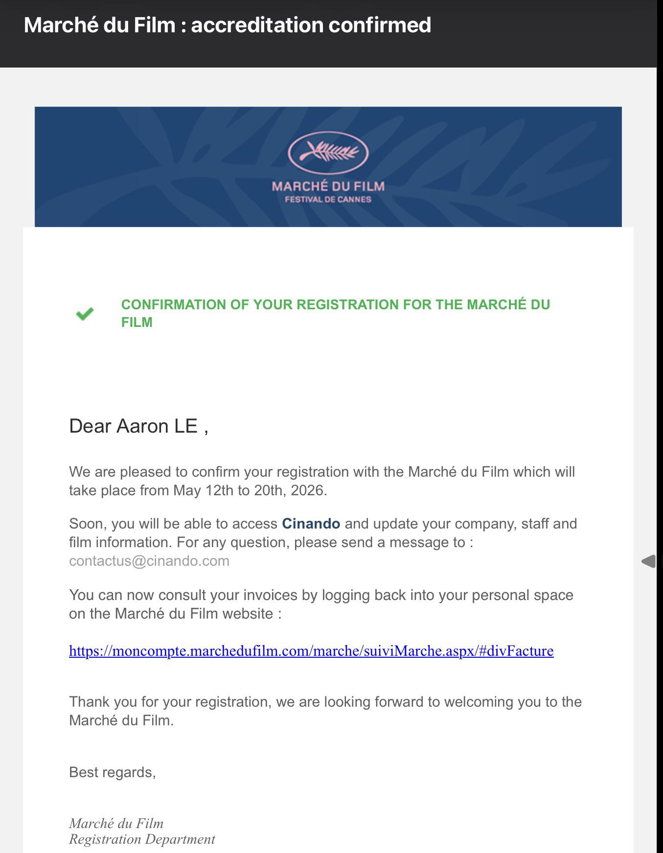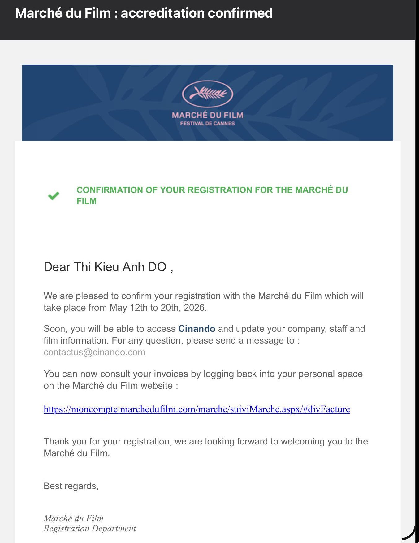 Angie Kiều Anh Đỗ và Aaron Le đã chính thức được cấp accreditation với vai trò Producer tại Marché du Film trong khuôn khổ Festival de Cannes — một dấu mốc mang nhiều ý nghĩa đối với hành trình phát triển quốc tế của Cinexia Productions 🎬